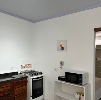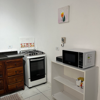 • Cozinha equipada com Fogão, Geladeira, Panelas, pratos, talheres e Microondas.